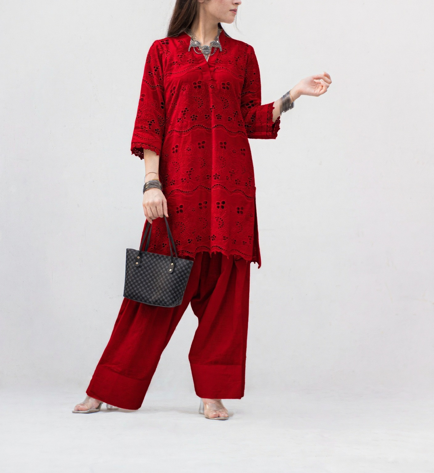 Fresh, timeless, and effortlessly graceful — this Red Chicken Kari 3-piece is your perfect pick for warm-weather elegance. The shirt features delicate chicken kari embroidery on lawn, paired with a soft lawn inner for breathable comfort. A self-print plain white shalwar adds to the refined look, while the lightweight chiffon dupatta brings a soft, flowing finish. Ideal for casual summer days, festive mornings, or serene gatherings.
